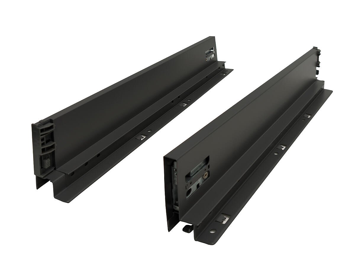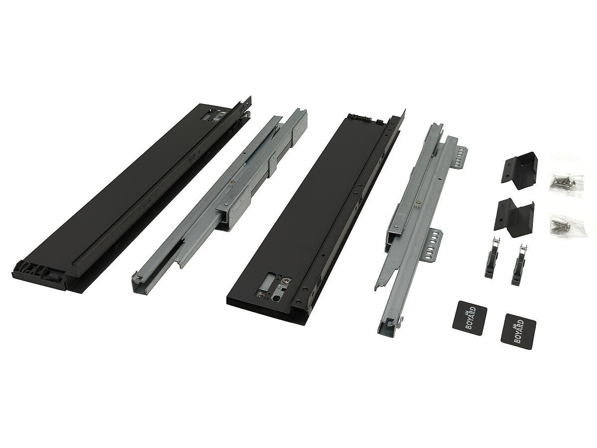 В комплект входит: левая и правая направляющая, прямые боковины, держатели фасада и задней стенки, заглушки и необходимый крепёж.